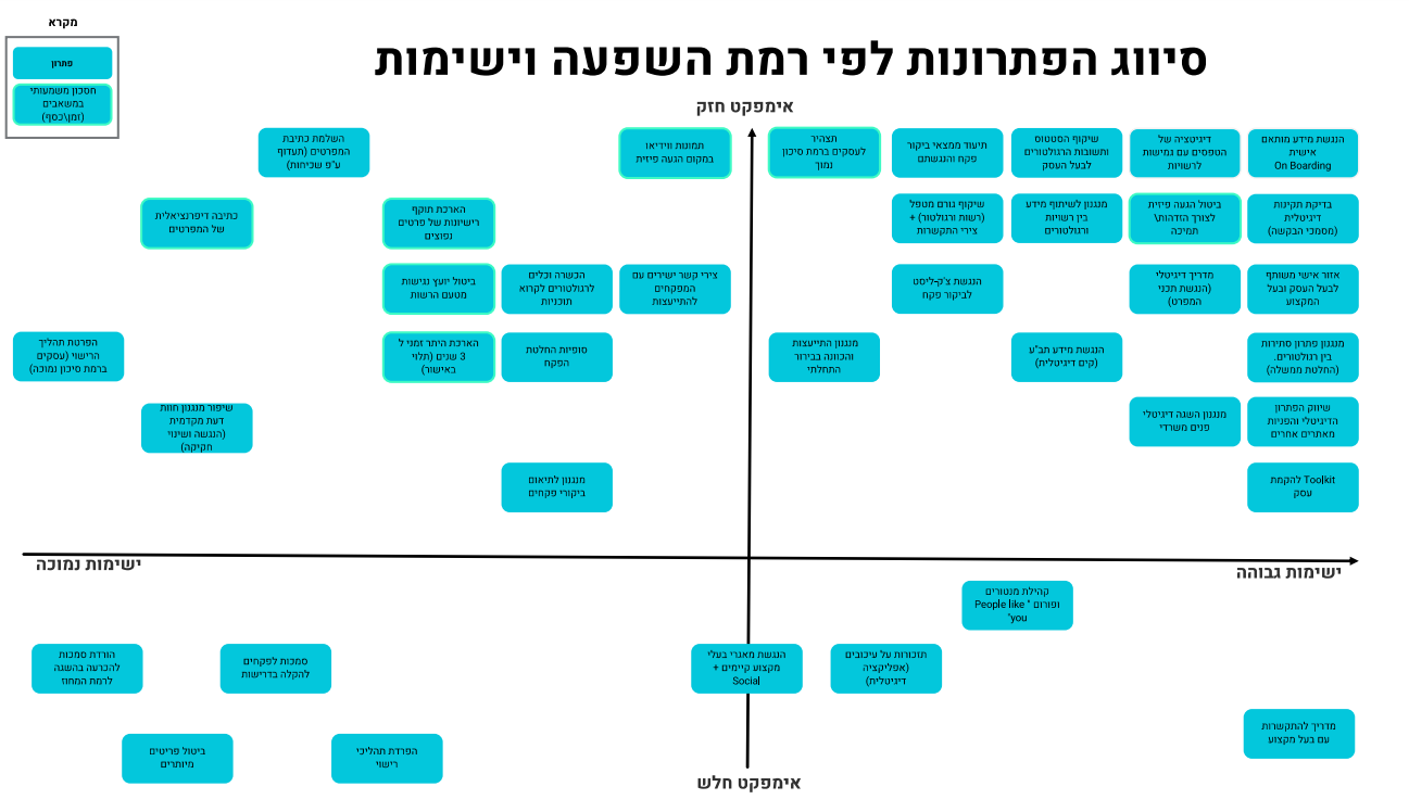 בחנו חלופות שונות לקונספטים לפתרון ומיפינו אותן על שני צירים, לפי מידת השפעתן על מסע הלקוח (עד כמה האימפקט שלהן משמעותי) והישימוּת שלהן בפועל.