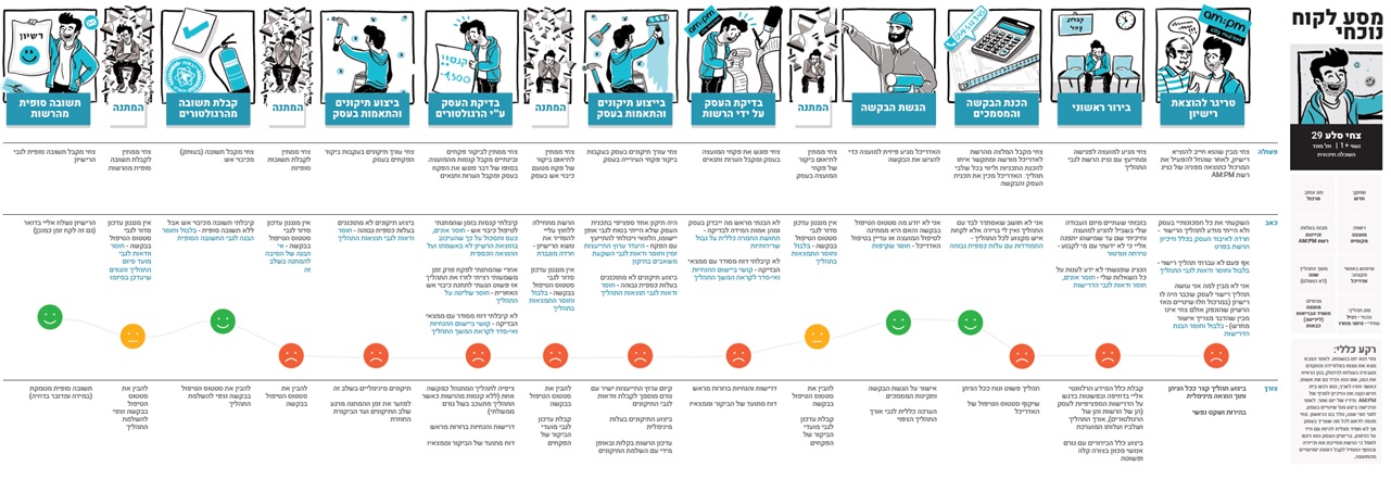 על בסיס המיפוי אפיינו 3 משתמשים טיפוסיים (המכונים "פרסונות") של בעלי עסקים העומדים בפני תהליך הרישוי. בחנו את הפעולות, הכאבים והצרכים של כל אחת מהפרסונות לאורך הדרך. התוצר בשלב זה היה תרשים מסע לקוח שמגדיר את התהליך שעובר הלקוח כיום.